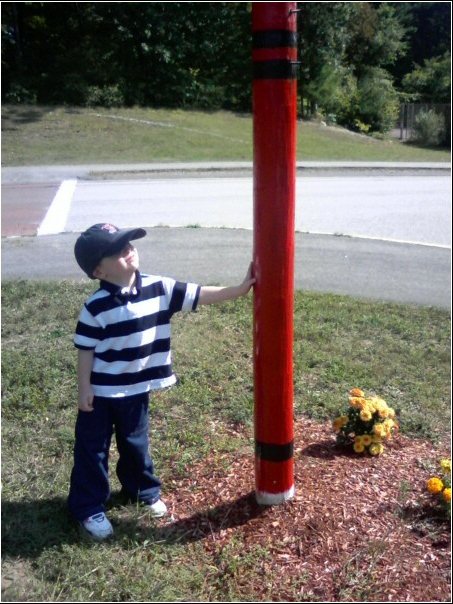 Every time I take Burke to his speech class at a local elementary school, he is fascinated by this huge red crayon out front. (It’s so big that I couldn’t get the top of it in the picture!)