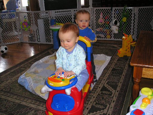 This picture was taken on March 11, 2006. Burke enjoyed pushing Maggie around and around on their little car. And Maggie loved being pushed. 🙂