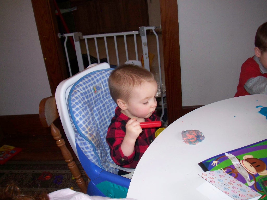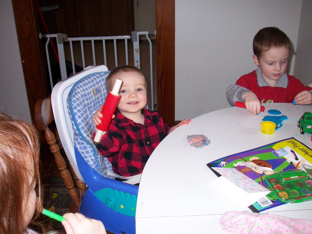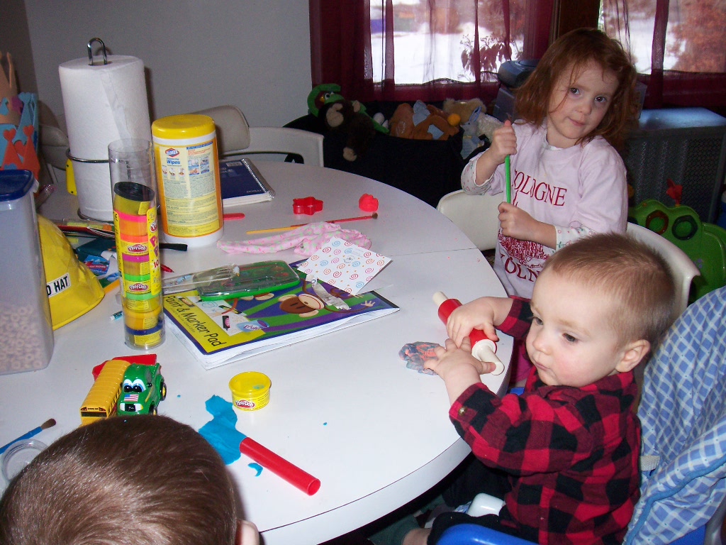 This week, it’s Play-dough fun time. Logan was really enjoying himself, and Maggie was right there to help him out (not that Logan wanted any help…).