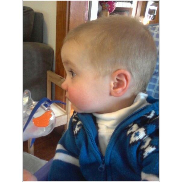 Logan has been such a good kid through all of this (and this). Our typical MO right now is to strap him into his high chair and let him watch some TV while I pump the meds to him through the nebulizer.