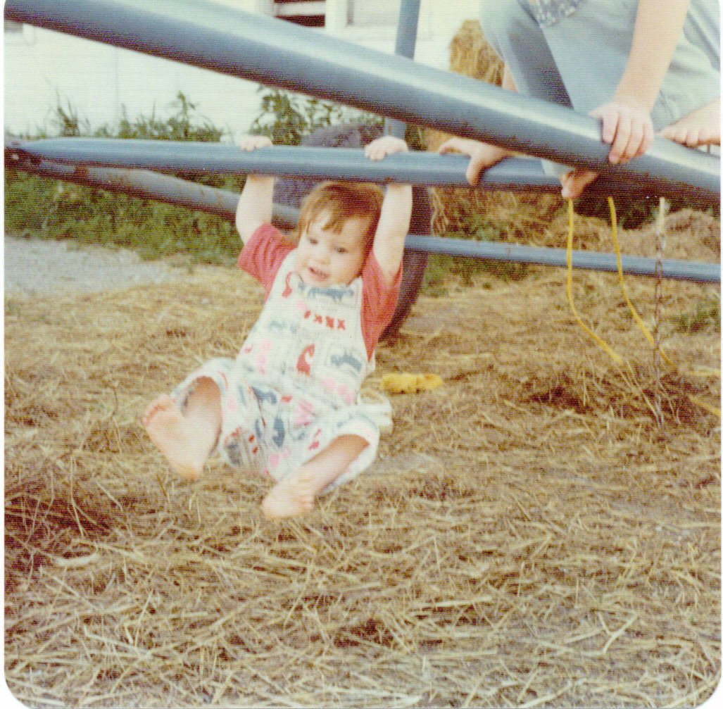 I must have been about Logan’s age here. I have a *lot* of memories playing on this thing…higher up when I got a little older. Growing up on a farm provided lots of “playground equipment” LOL