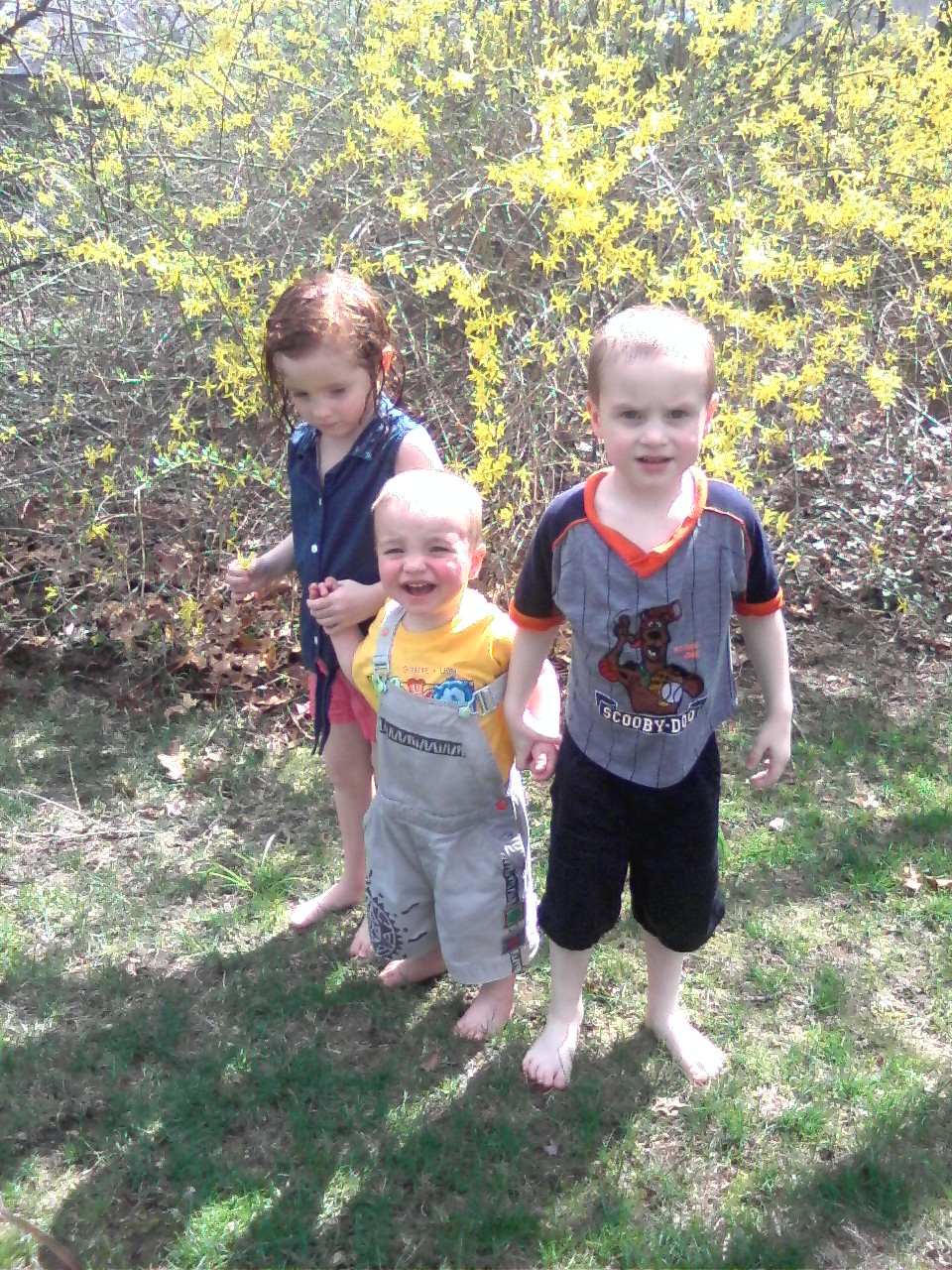 This week’s theme is Flower Power. We JUST came back in from playing outside in the sprinklers and with the water table. On our way back in, I remembered that it was BPS, so I made the kids pose in front of some of our flowers. They were less than thrilled…and a more than a little wet 😉