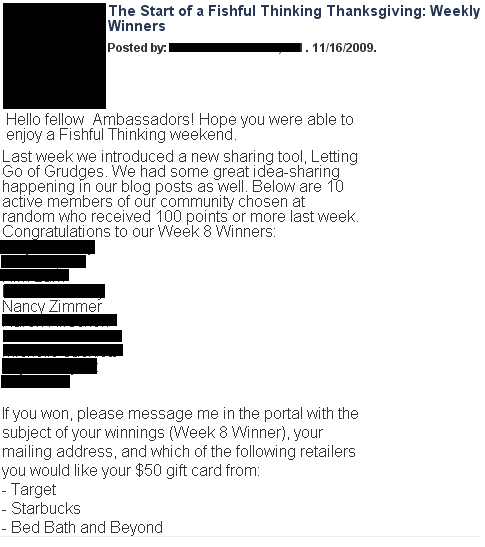 The first was my name on the list of winners for the week. (Who can’t use an extra $50 around the holidays??)