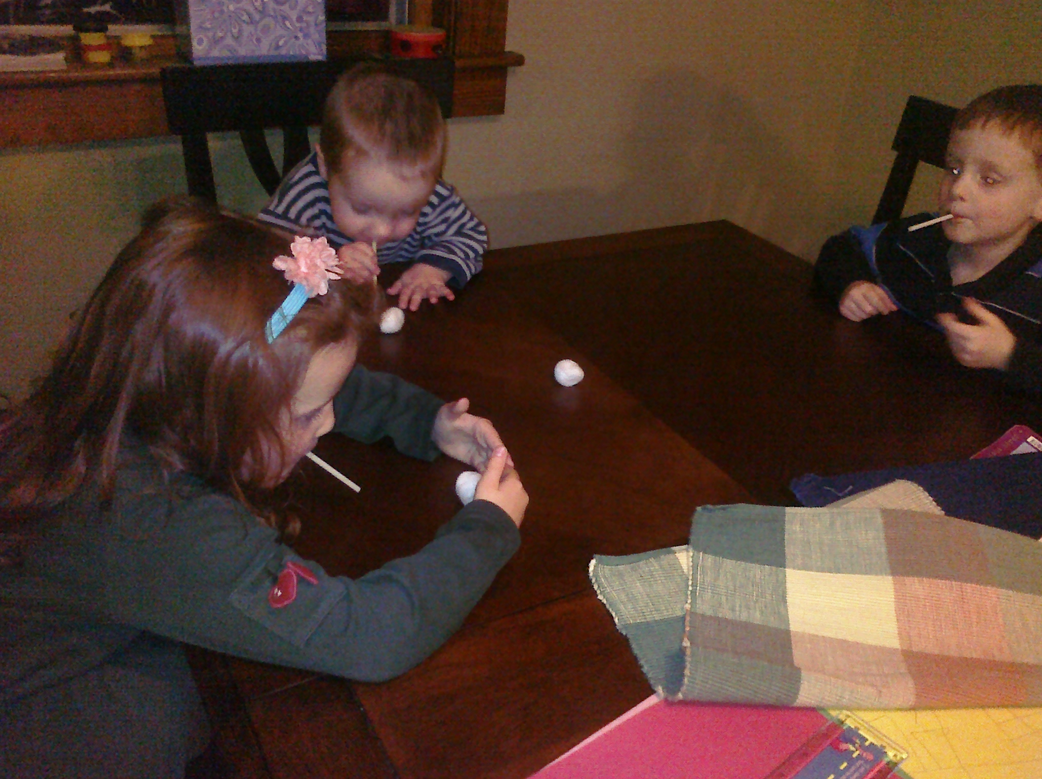 Maggie’s Speech class homework this week as to blow a cotton ball across the table with a straw. (It’s supposed to teach her to speak through her mouth rather than through her nose.) All 3 kids had a blast with it.
