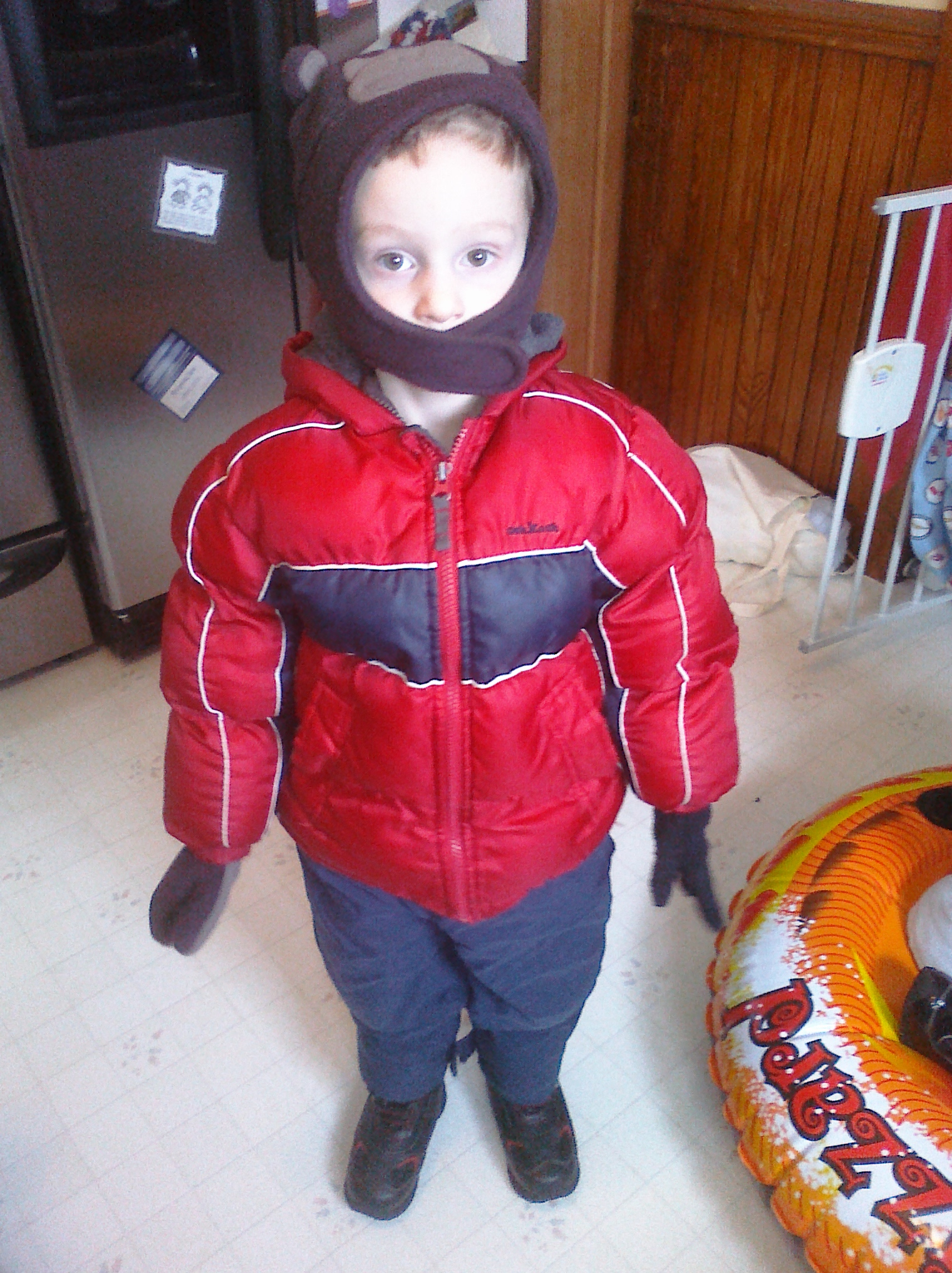 (Yes, he has two different mittens on here…we’re still looking for the other brown one. Oops!)