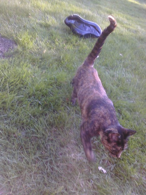This pretty kitty showed up in our back yard yesteday…obviously hungry. We, of course, fed him (her?)…and he came back today. So we fed him again. 🙂