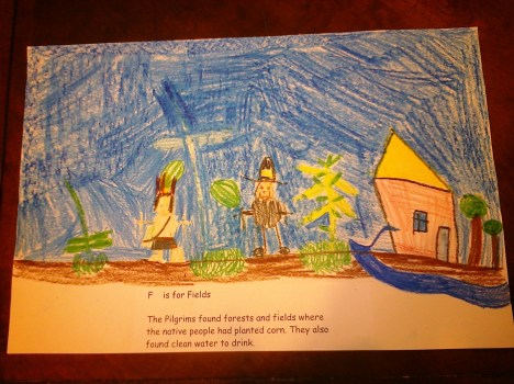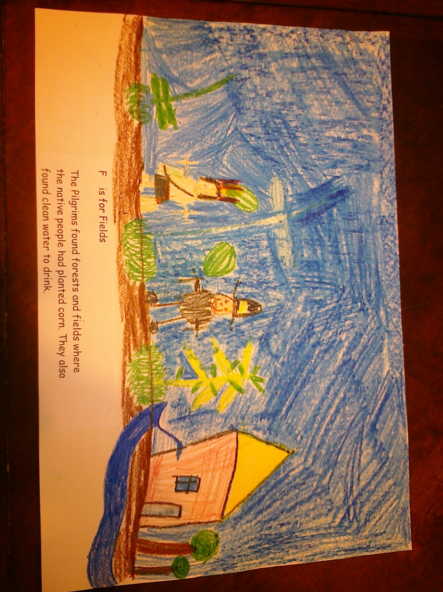 Today’s assignment was to create a picture to help remember the words. Nanny Jessica helped out a little (the river, the corn, some tufts of grass, and the watermelons). Burke drew the rest.