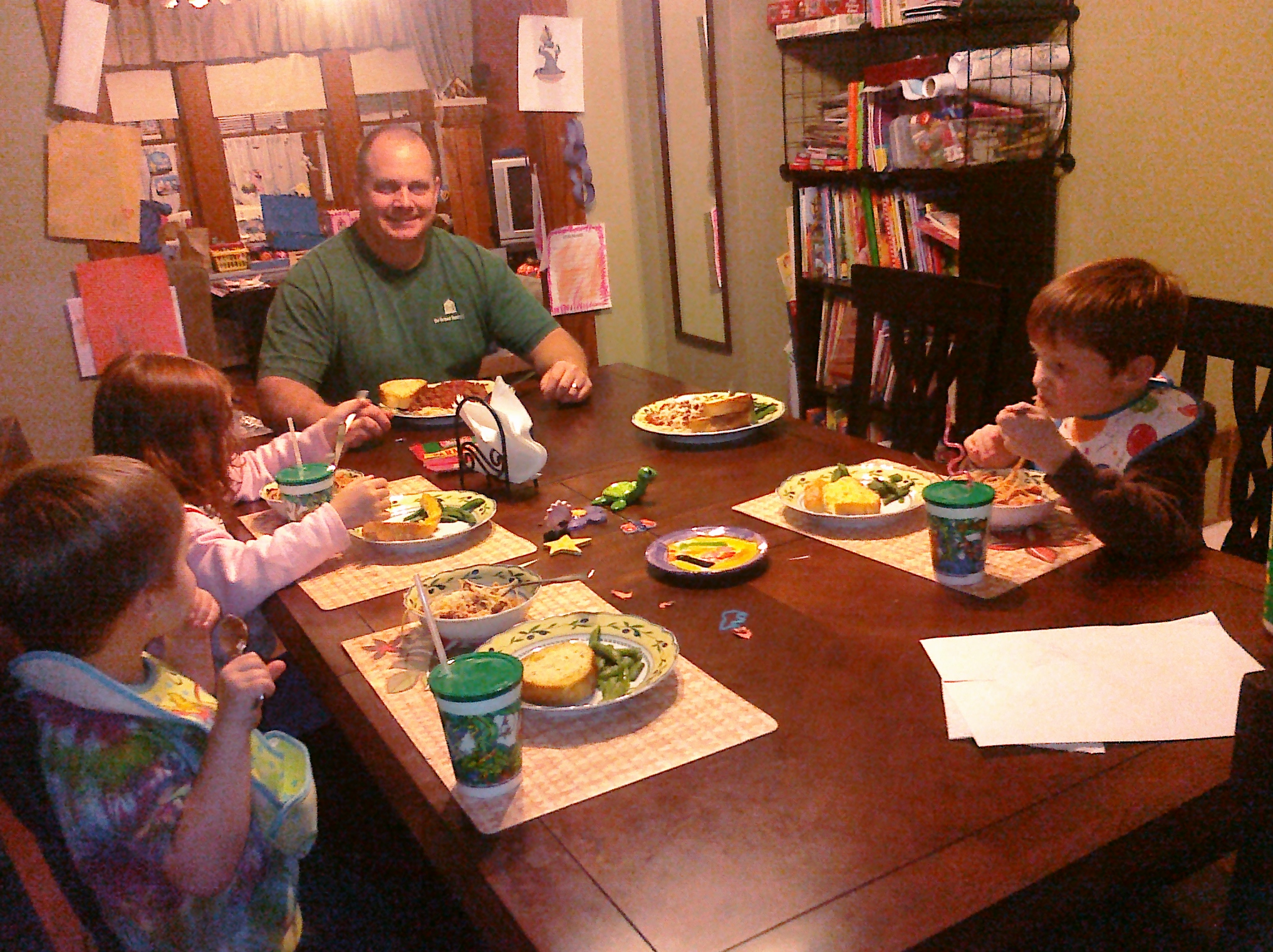 Nice! We’re lucky that with T’s teaching schedule and my tutoring schedule, we’re almost always both home for dinner with the kids. Our guys are finally at the age where they like to talk about what they’ve done during the day. They aren’t always accurate retellers, but it’s fun to hear them try.