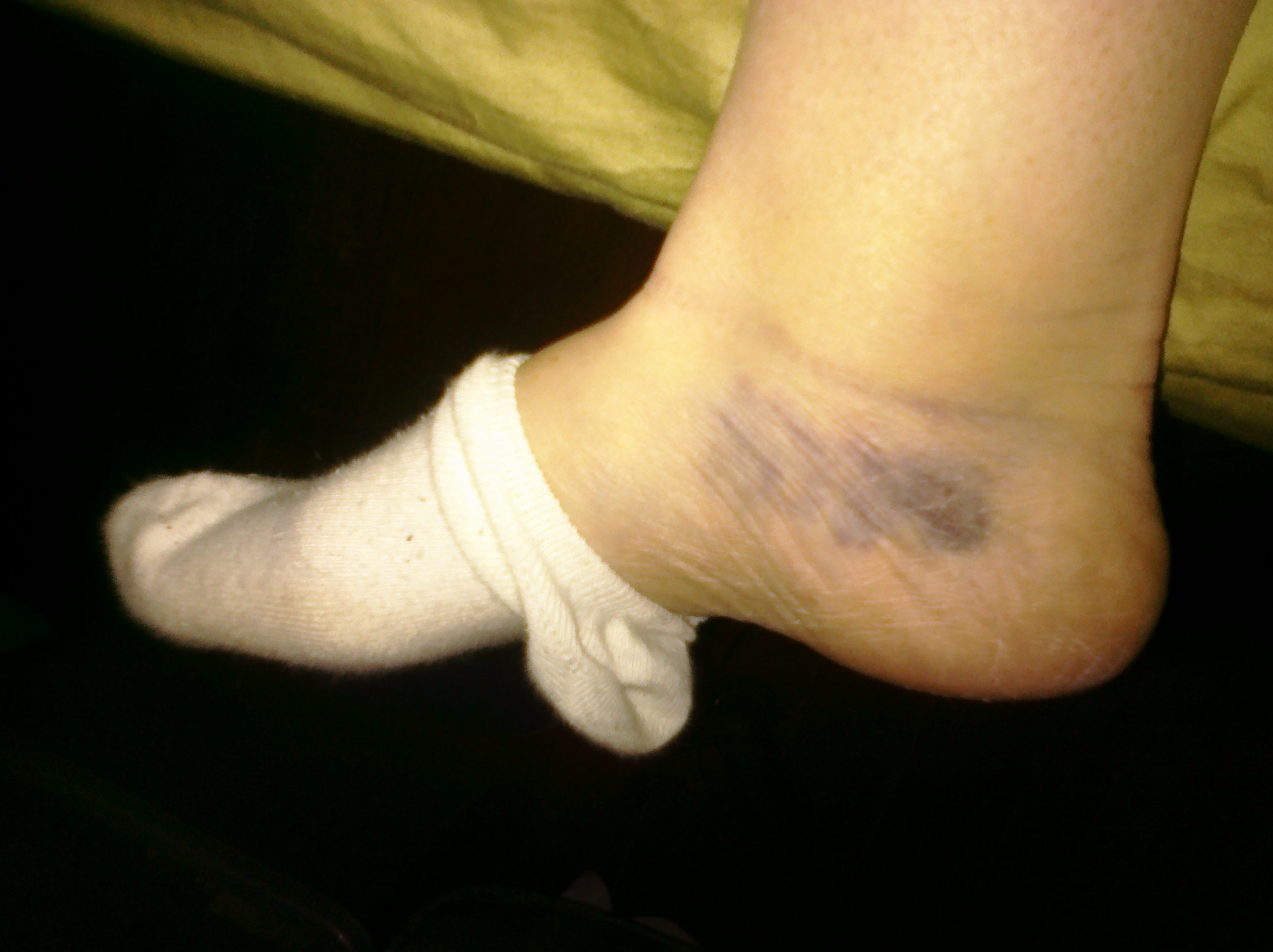 Higgins ran into my shin – running at top speed after the cat – one week ago. I still have a bruise on my shin, but the blood is pooling at my ankle…where he didn’t even touch!