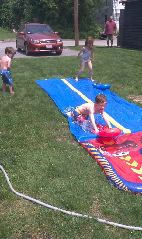 It’s a wee bit too chilly for ME to hit the water, but the kids are having a fantastic time on their Cars Slip n’ Slide 🙂