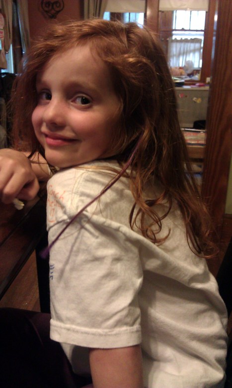 A few of the ladies in our town held a fundraiser for Relay for Life. They charged a few bucks (or more…) to put in purple hair extensions.
