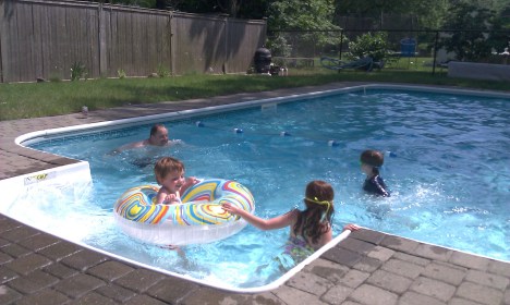 Mike has today off, so I took it off and we gave Nanny C. the day off too. And since we’re house sitting for neighbors who have a pool…we’re spending the day relaxing in the water.