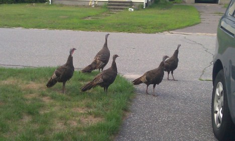 These guys (Momma and 5 babies) walk all around our town. Right here, they’re just hanging out in our driveway – driving Higgins crazy. 😉