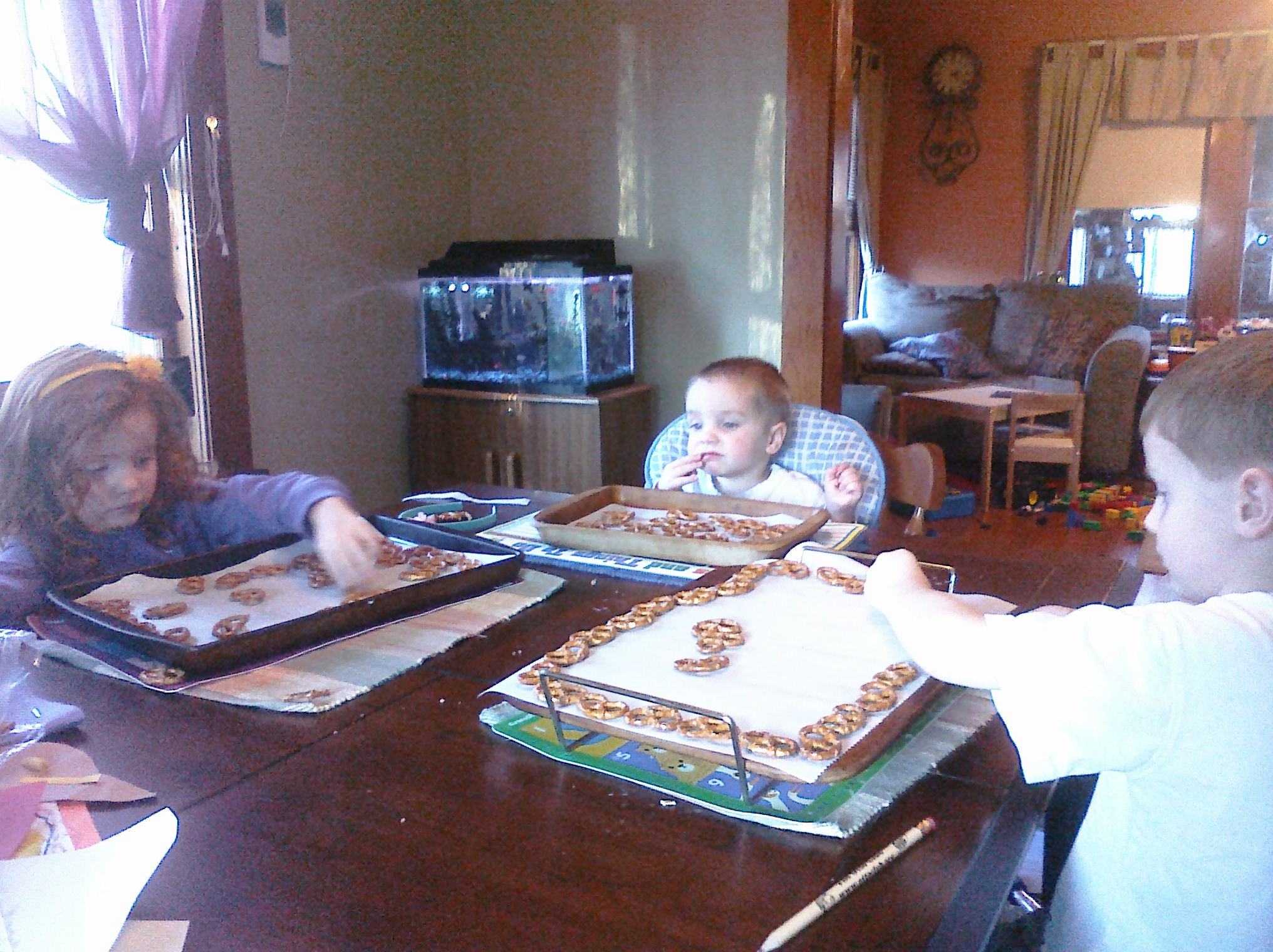 I lined 3 cookie sheets (mine are stoneware) with parchment paper and put one in front of each kid. Then I put a pile of “heart pretzels” (as Burke calls them) by the cookie sheets and told the kids to spread them out over the cookie sheets.