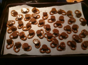 Then came the Rolos. We unwrapped them and placed one on each pretzel. (Again, Logan had a hard time with the “Don’t eat them yet!” heh)