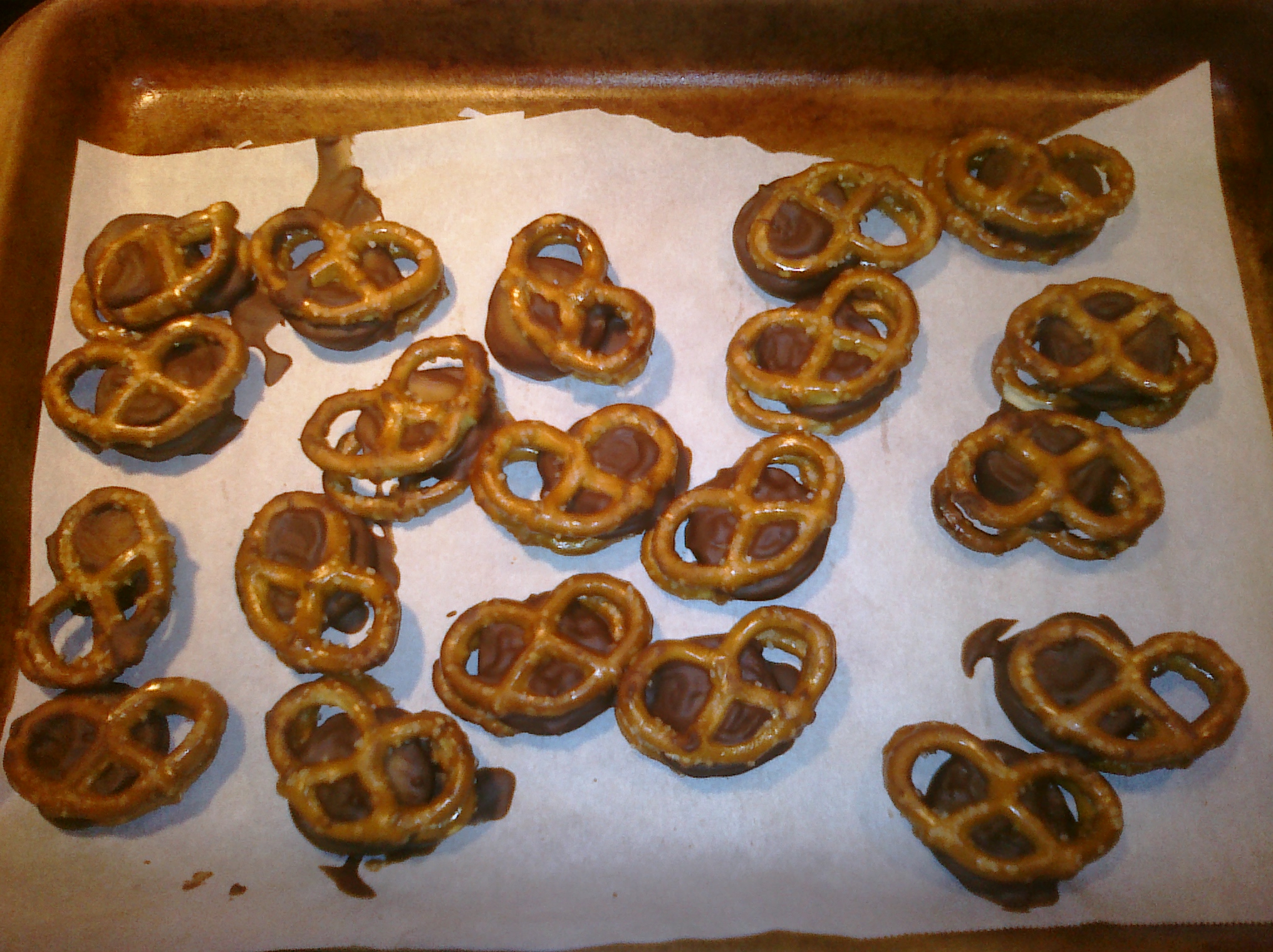 The PTO ladies brought snacks to the session last week. One of the treats that disappeared quite quickly (with good reason!) was called “Prolos” – A Rolo sandwiched between two pretzels. HOLY COW, Yu-um. And easy enough to make with your kids!