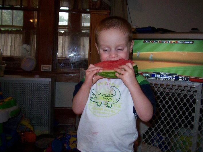Mike Grilled up some *really* tasty stuff: Steak, ribs, hotdogs, kielbasa, potatoes, peppers, onions, and zucchini. And we made some corn as well. The pan fried version of it all was darn good last night too. On the 4th, we also had watermelon…Burke’s 1st piece was almost as big as him! π (yes, he had more than one…and then more for breakfast yesterday!!)