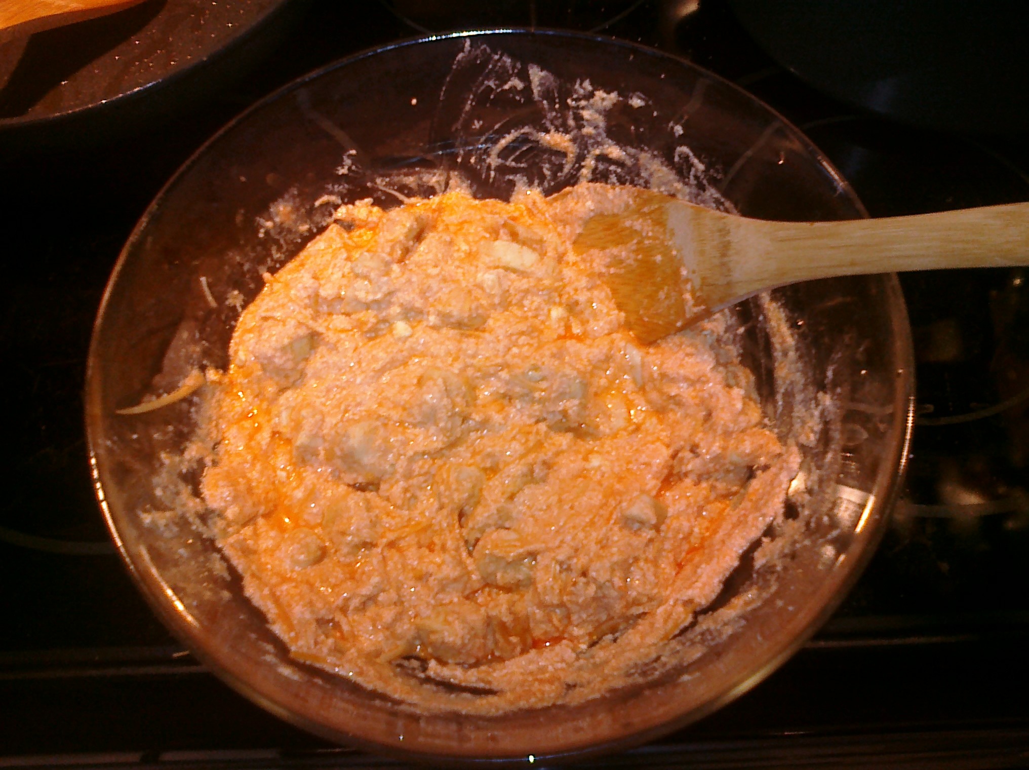 - Stir cooked chicken into the cheese and hot sauce mixture.