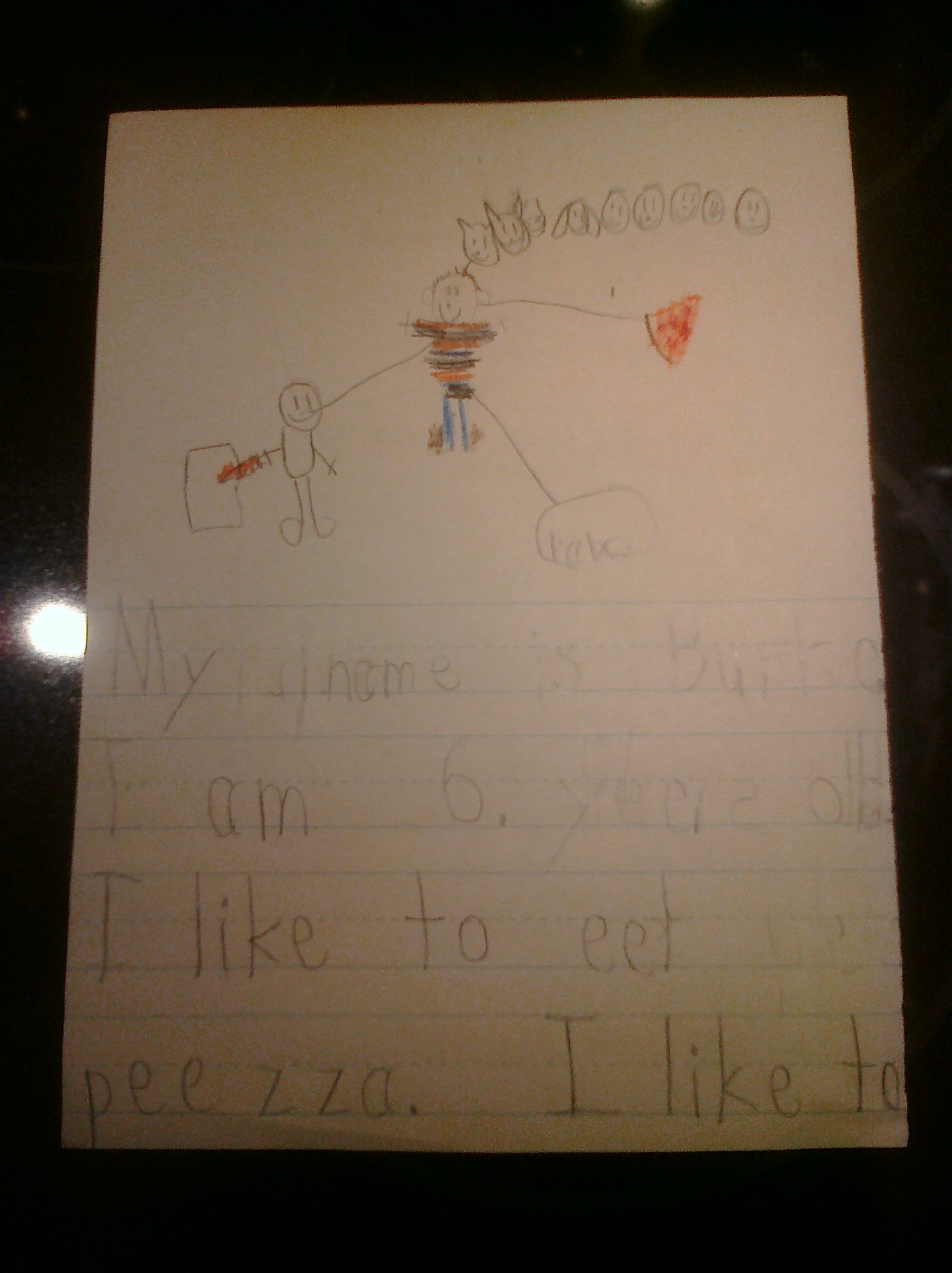 Translation: My name is Burke. I am 6 years old. I like to eat pizza. I like to go to Jump On In with my friends. My favorite color is rainbow. I am beautiful.