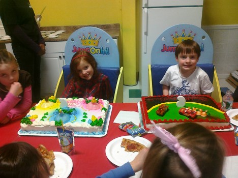 This *fantastic* place that has two rooms full of inflatable jump/slide/obstacle things. And they were so incredibly accommodating to the whole “I have twins in two different classes so there will be tons of kids, but I don’t want to pay an arm an a leg for two parties” thing. 🙂