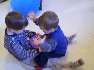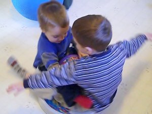 The thing is, Zimmers ARE strong…willed, anyway 😉 No, no, really…Logan was spinning the Sit-n-Spin around … with both him and Burke on it. Scrappy little bugger. 🙂
