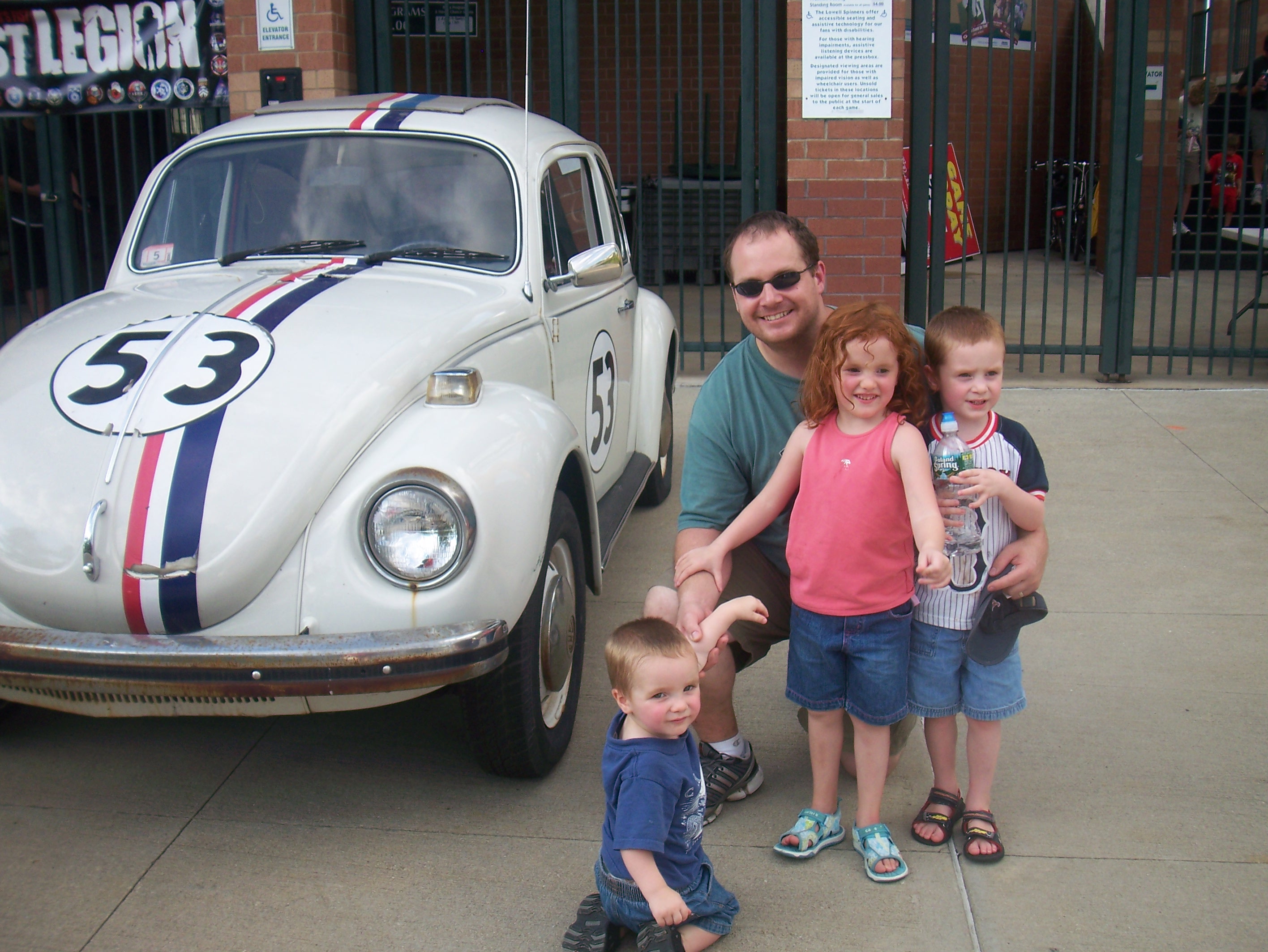 We went to the Lowell Spinners baseball game last Saturday (see a video of it in my last post). For some reason, they have a Herbie the Love Bug car out front. Kinda cool 🙂