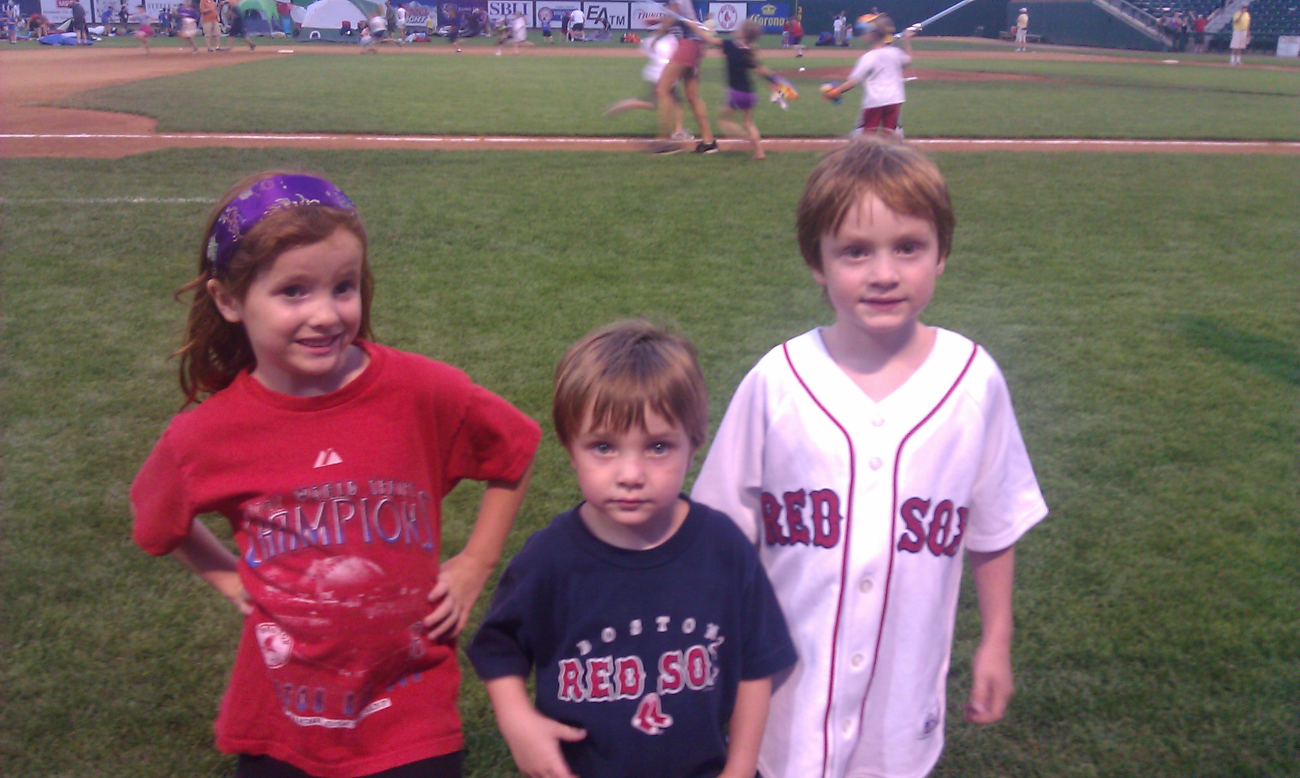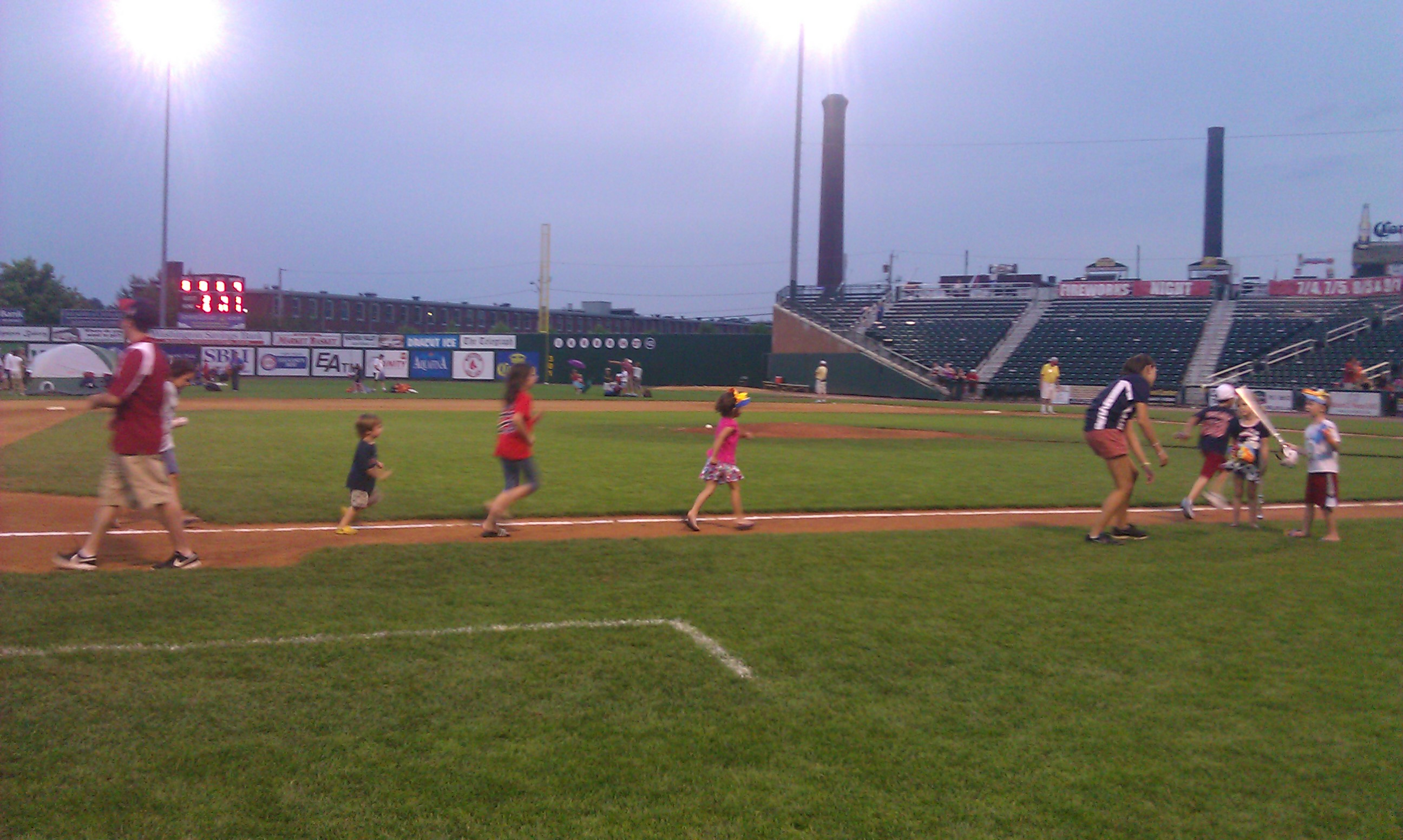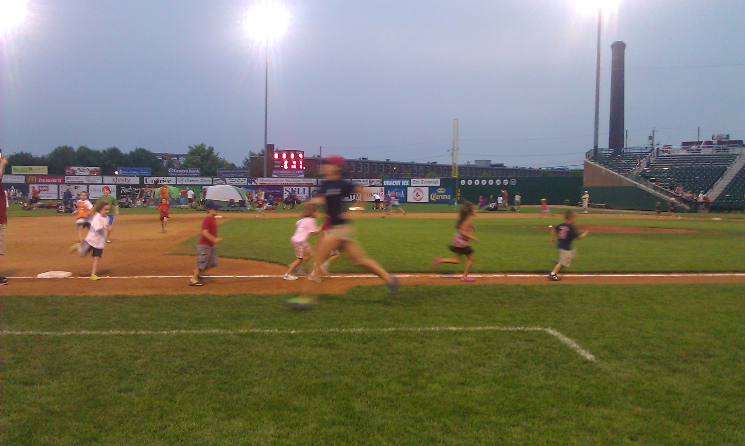 We went to see the Lowell Spinners over the weekend (as mentioned). The kids made it through the *entire* game for the very first time! And what a prize at the end…all kids are allowed to run around the bases. How cool is that?!