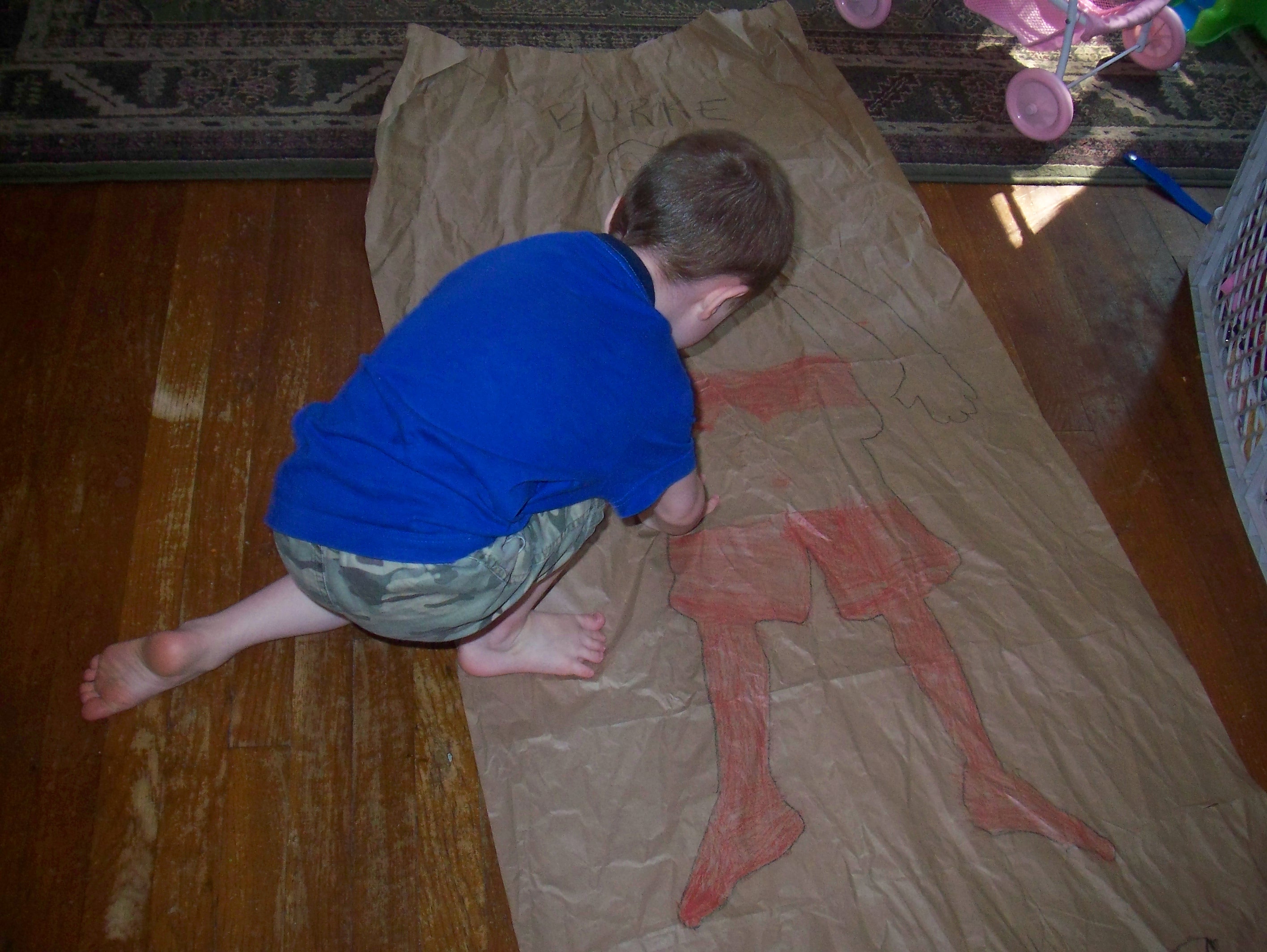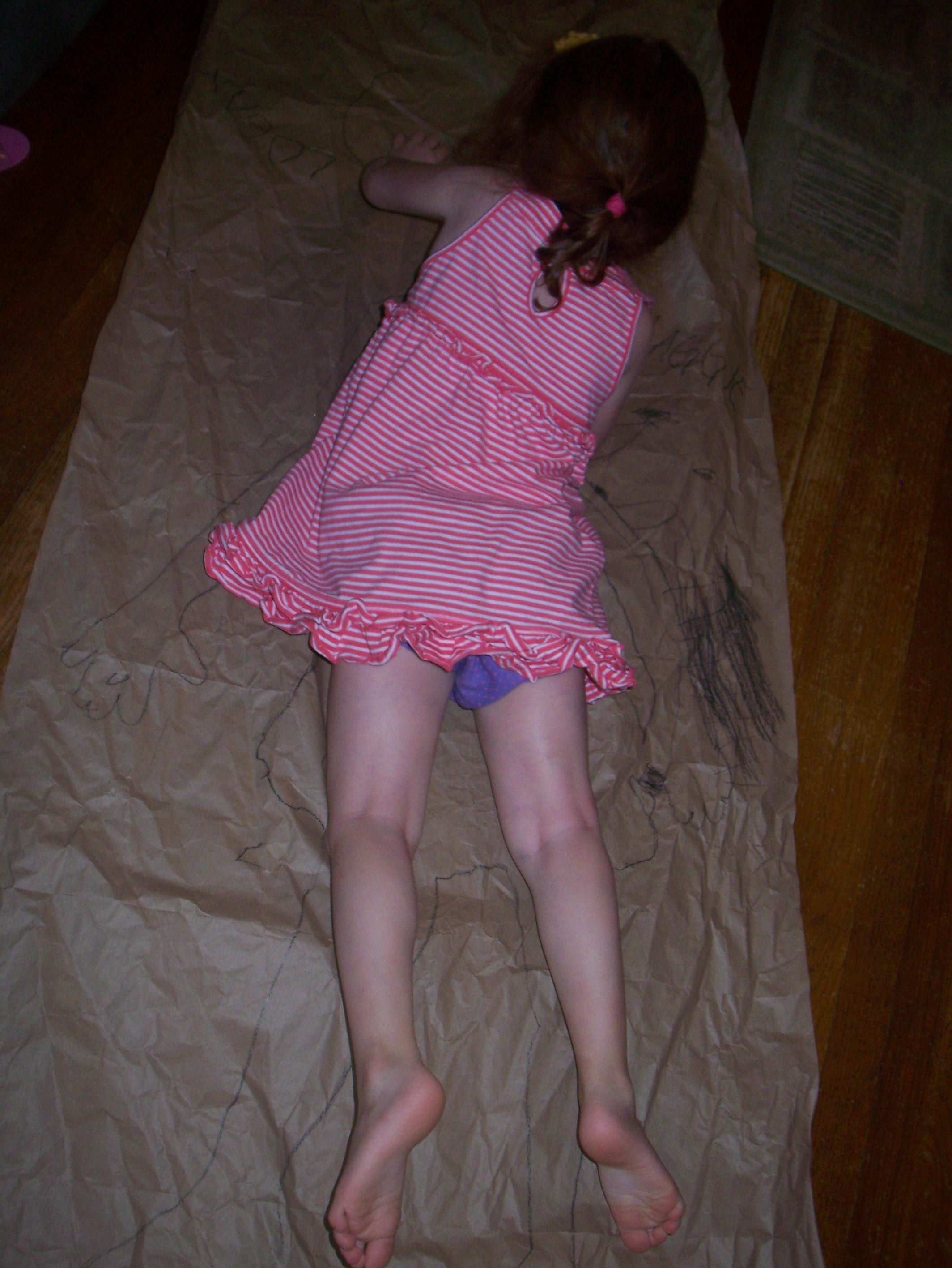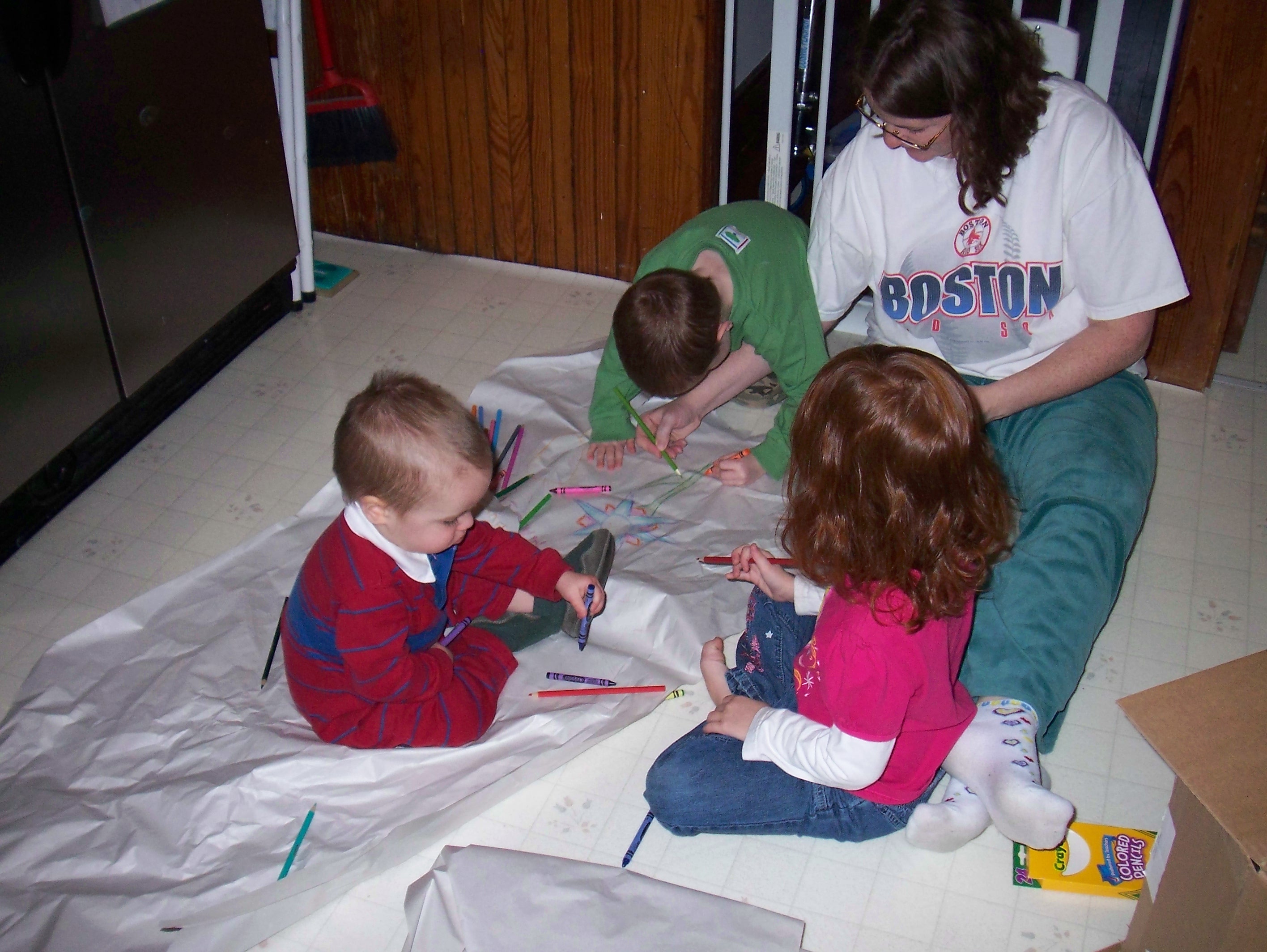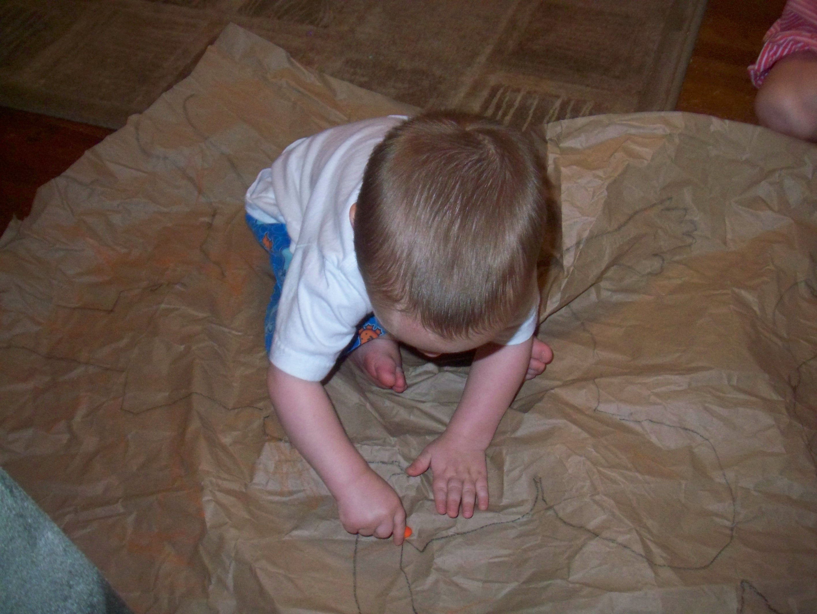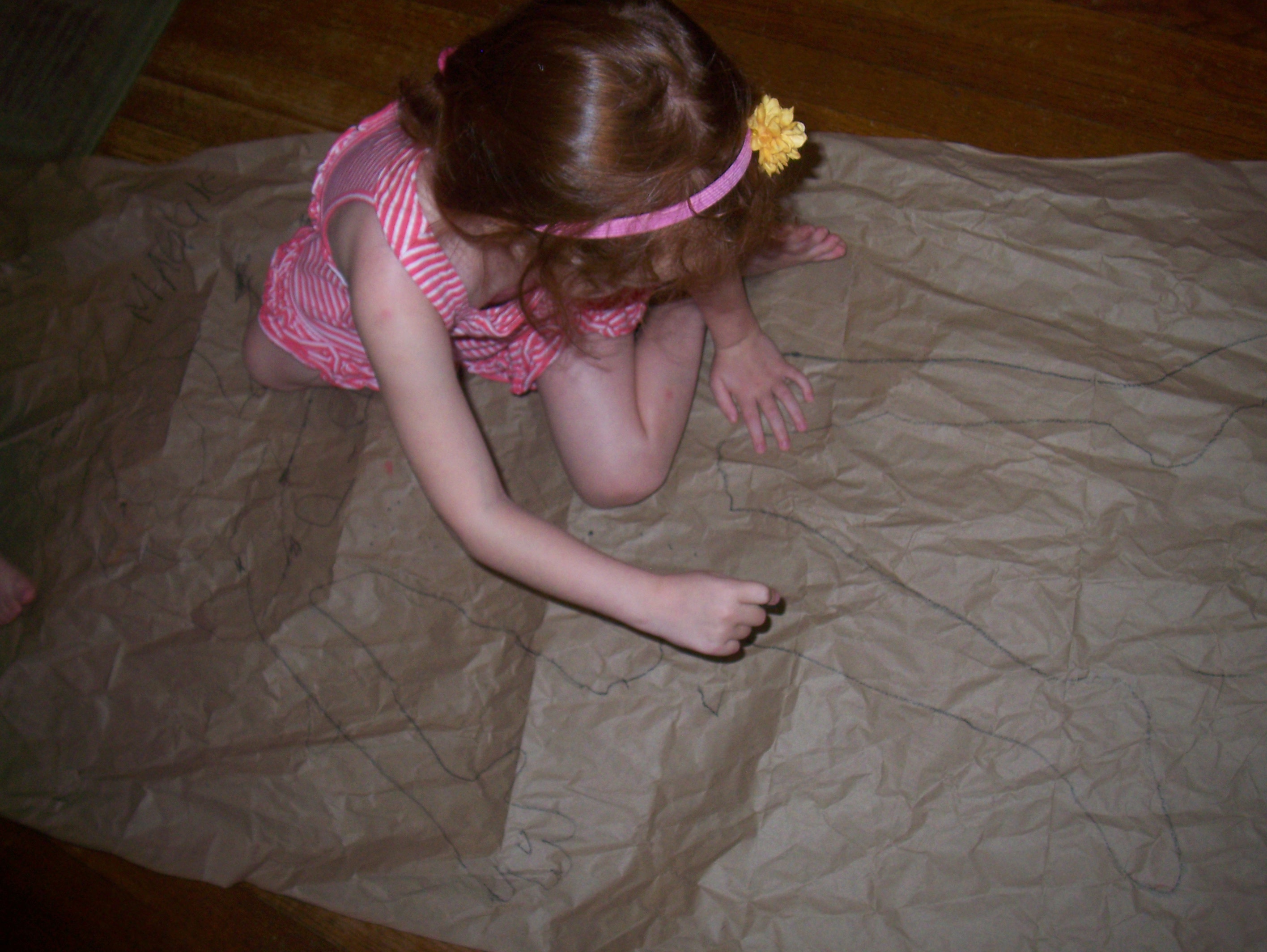 These pictures were taken on Monday. I’d just gotten a package (the contents of my Giveaway!) that was secured with long, crumpled pieces of packing paper. We had much fun decorating them.