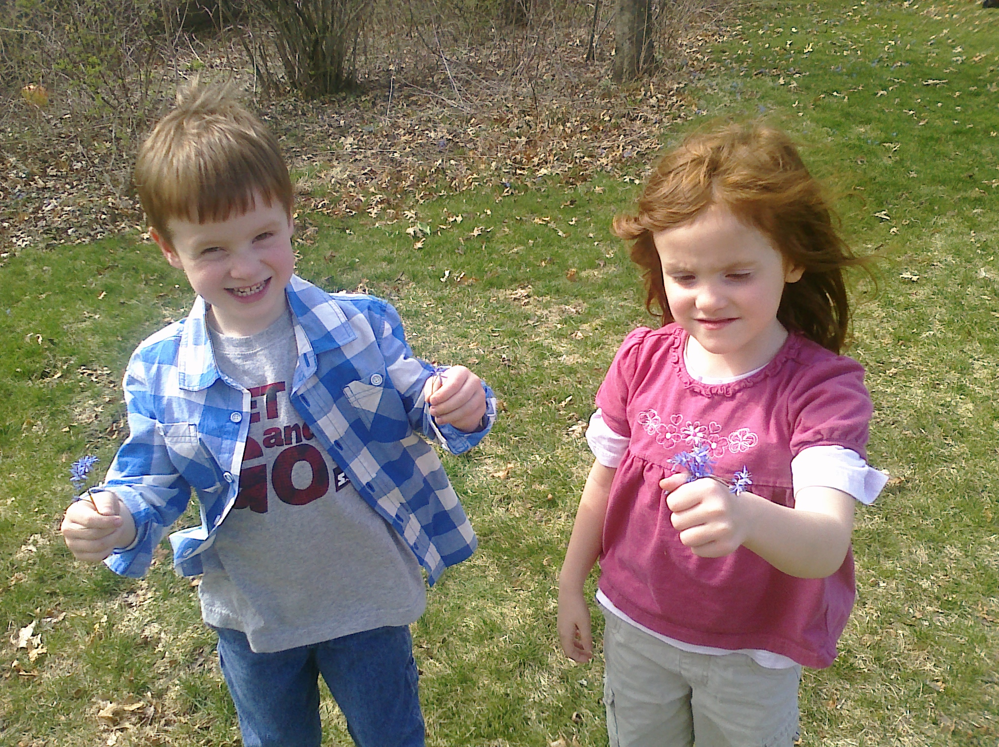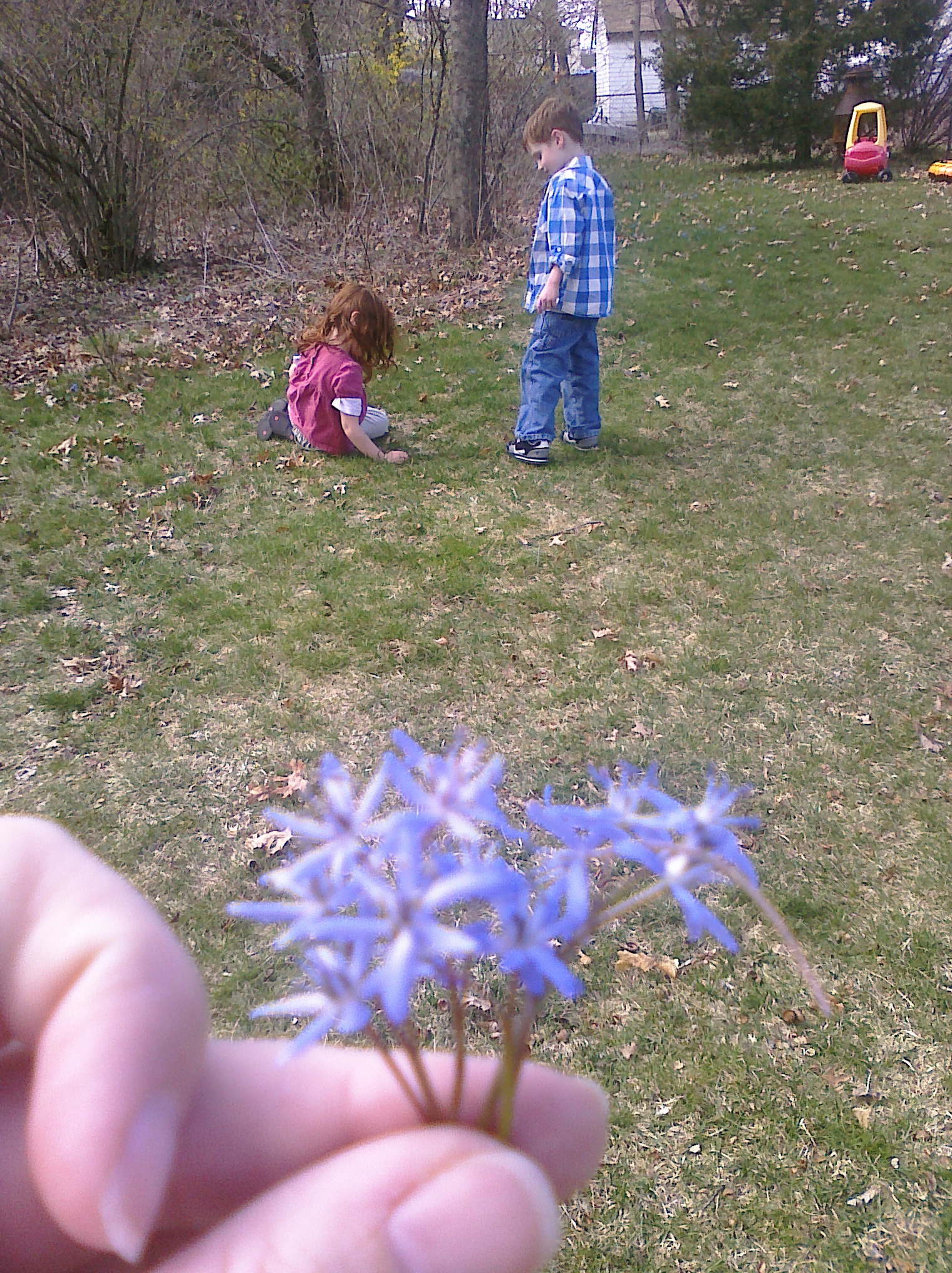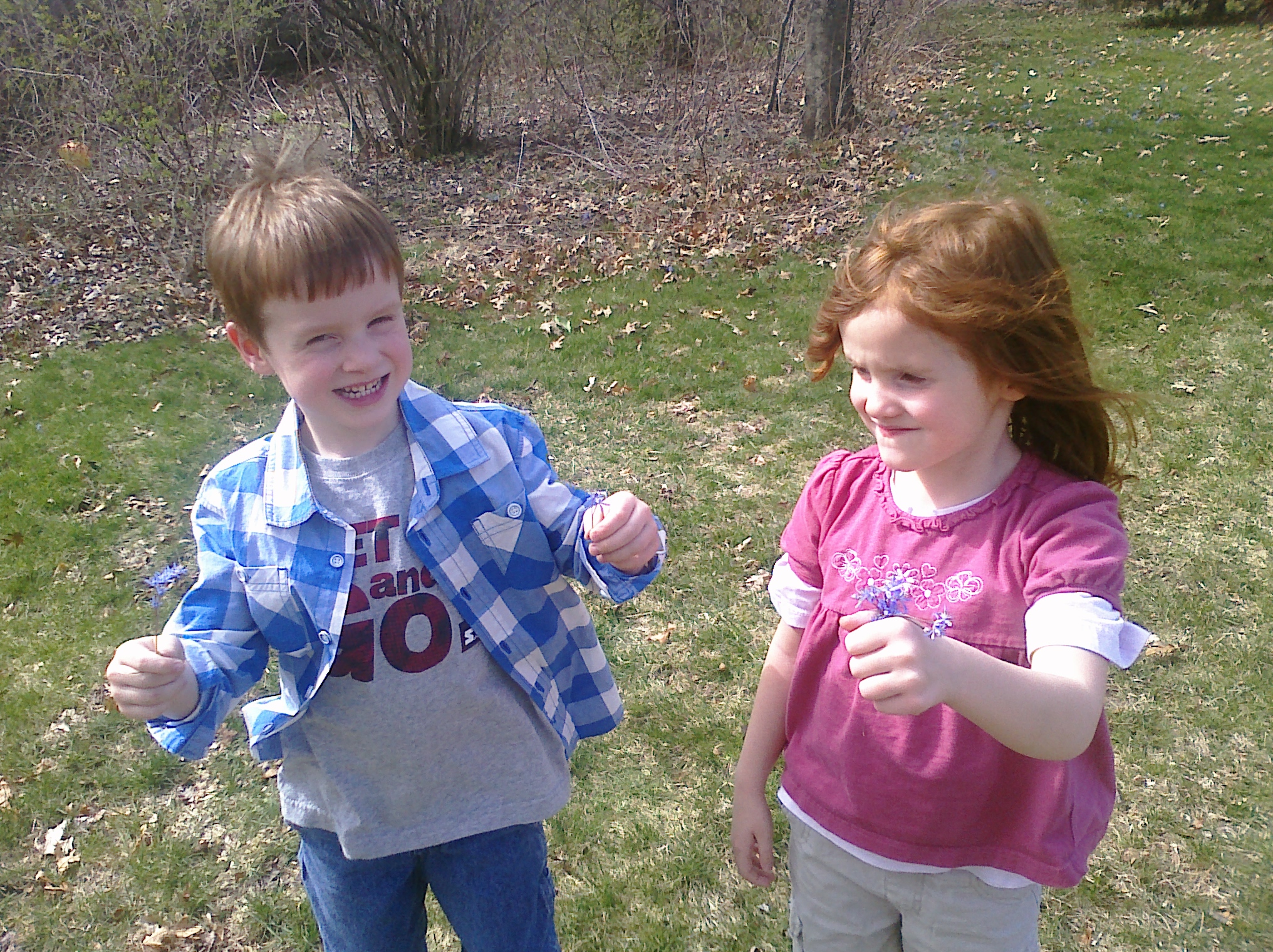 We have pretty purpley-blue flowers that grow on our lawn. When we got home from Vermont today, the kids started picking them for me 🙂