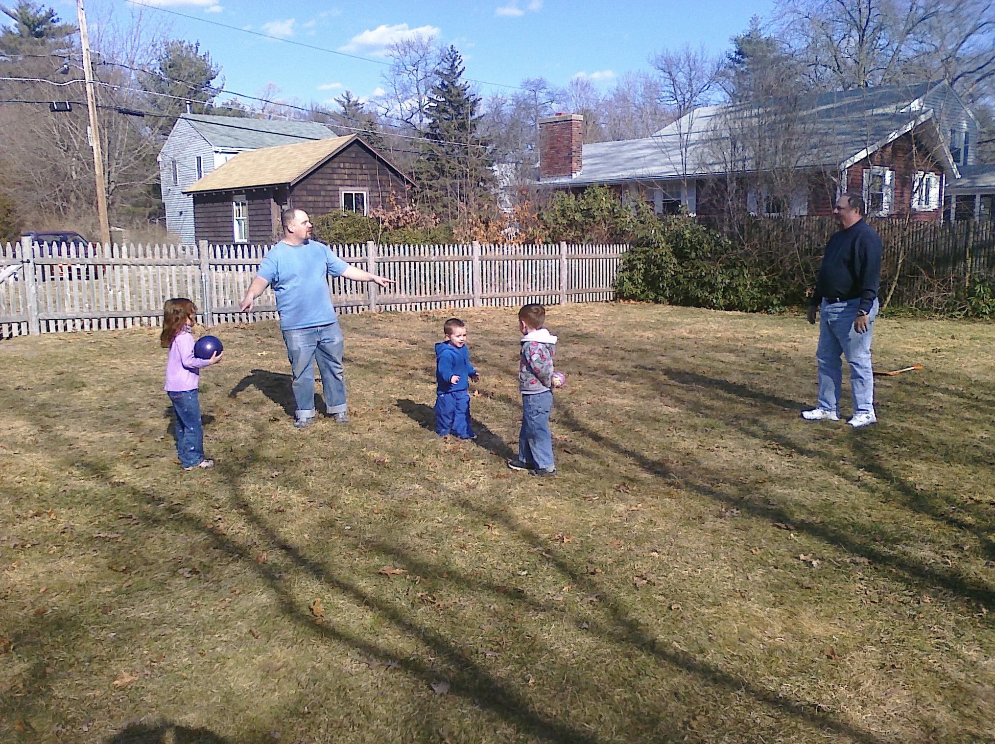 Mike and the kids are playing a rousing game of Freeze Ball (a cross between freeze tag and dodge ball)…in their jammies! (Well, Mike’s not in his…)