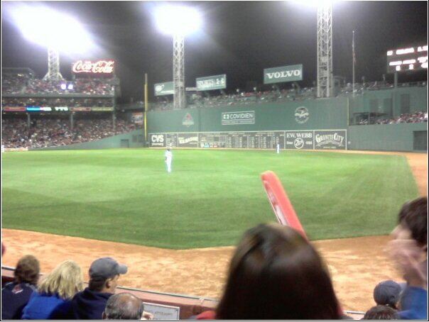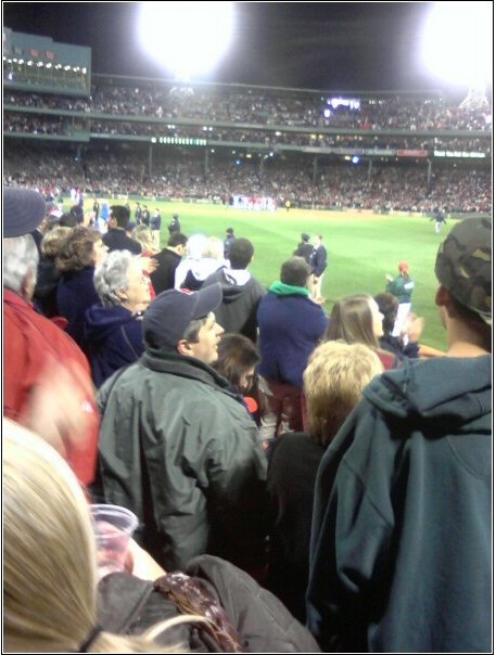 I drove to the subway station, met Mike on the platform out by his place of employment, and then we rode in together. When we got there it was, as usual, a mob scene. Go to find our section to sit down, do the typical enter the right section, turn around and look at the rows thing…but can’t see our row. I must have looked a bit confused because one of the attendents came over to help out and said, “Oh – your seats are right here.” She then turned us around and lead us to our seats *5* rows from the field … and wiped the seats down for us. Holy froofie! But OMG! We were 5 rows from the field!! We could See Jacoby Elsbury’s face! Of course, all I brought was my camera phone (duh, Nancy)…so the pictures don’t really do it justice.