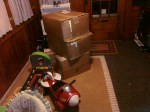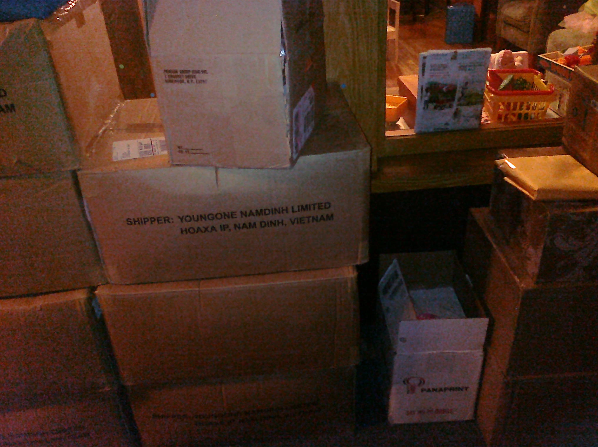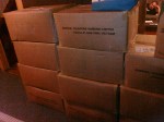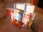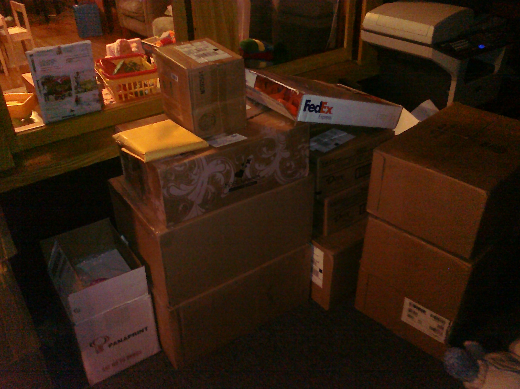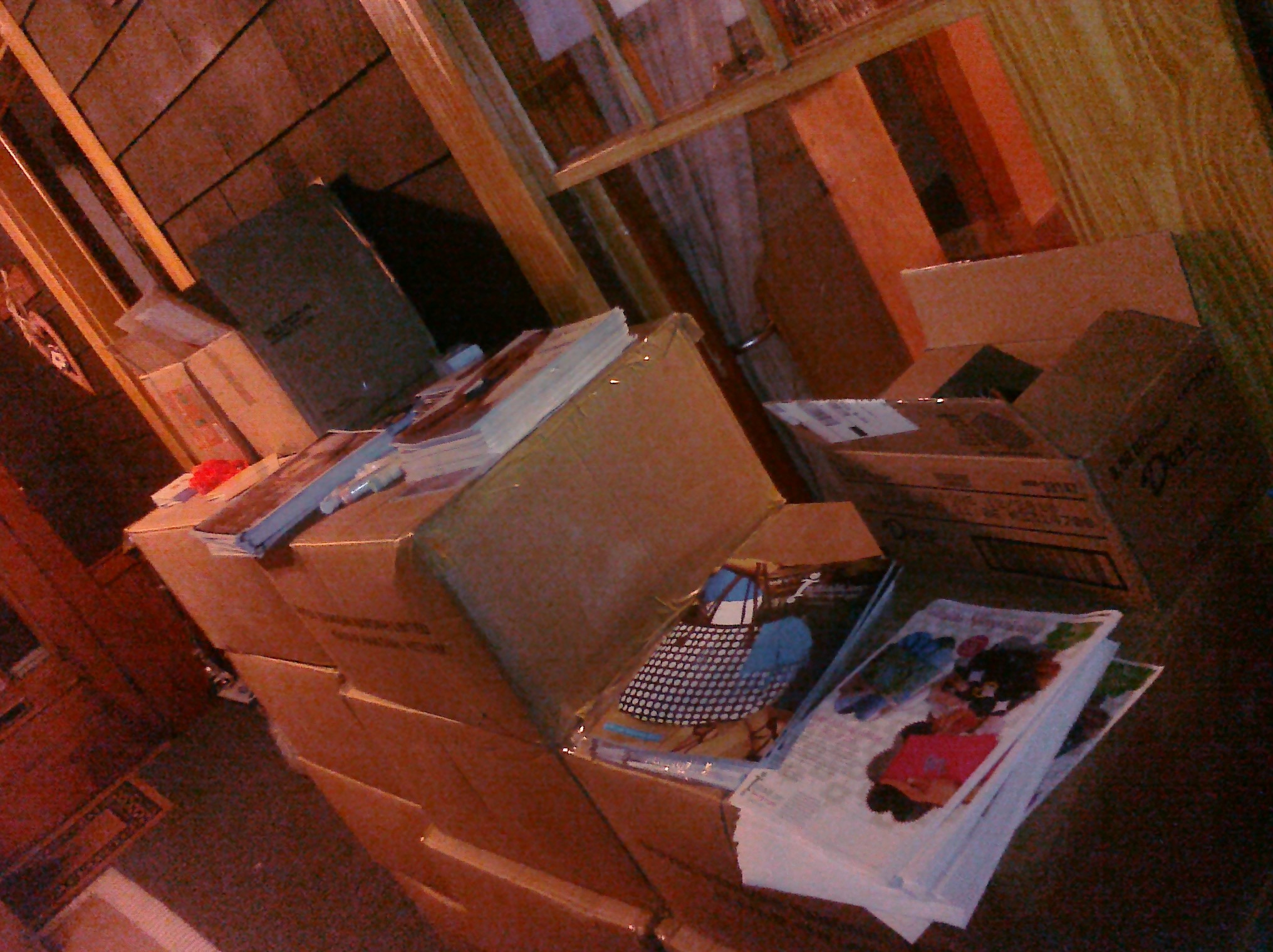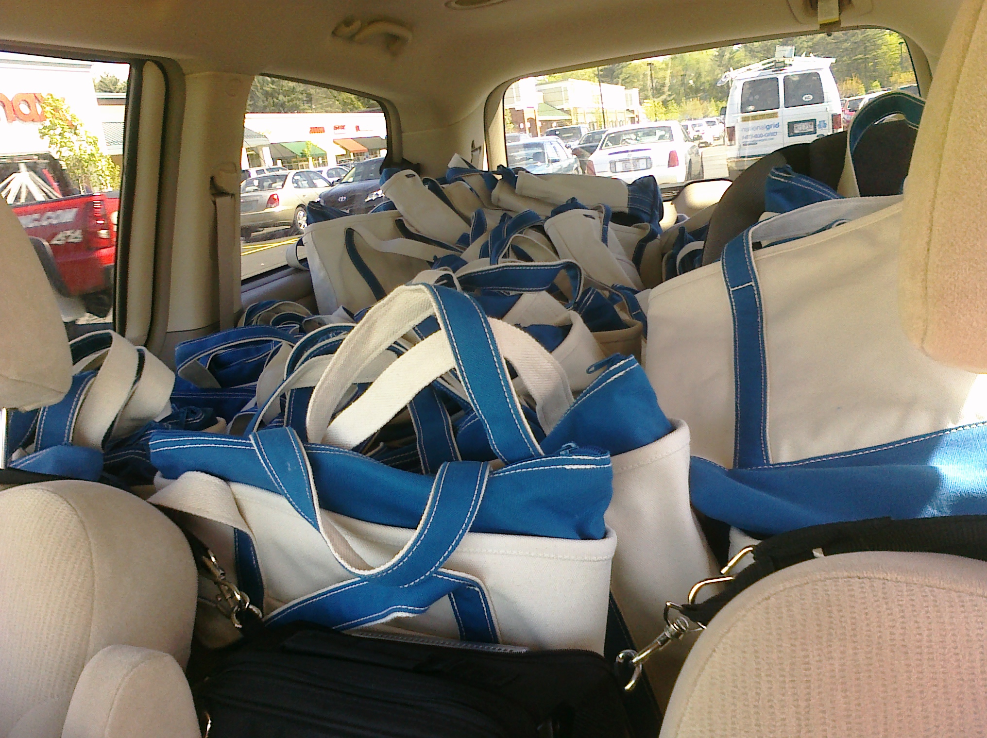 The pictures show the boxes upon boxes that have shown up at my door (13 boxes just for the totes!), my “stations” for putting the bags together, all of the stuff that goes into the totes (note: you won’t get an entire bag of Dove chocolates, but you will get a few 🙂 ), and the stack o’ bags I’ve been able to put together so far.