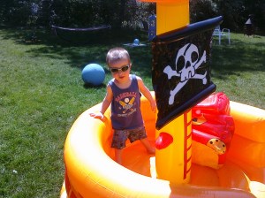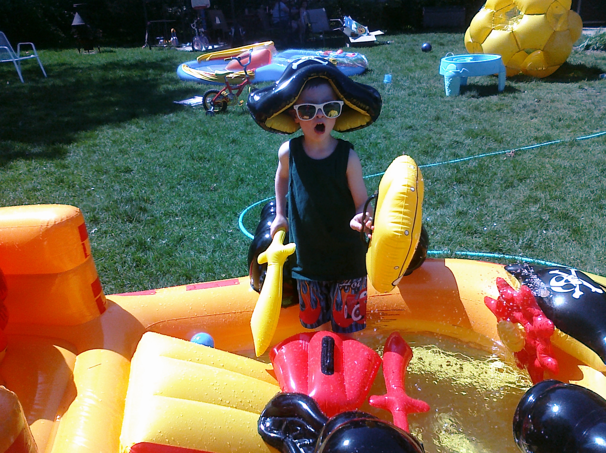 (Yes, those are inflatable pirate hat, shield, and sword – 2 sets! And an inflatable treasure chest as well. Oh and the cannons shoot water if you attach the hose. LOL!)
