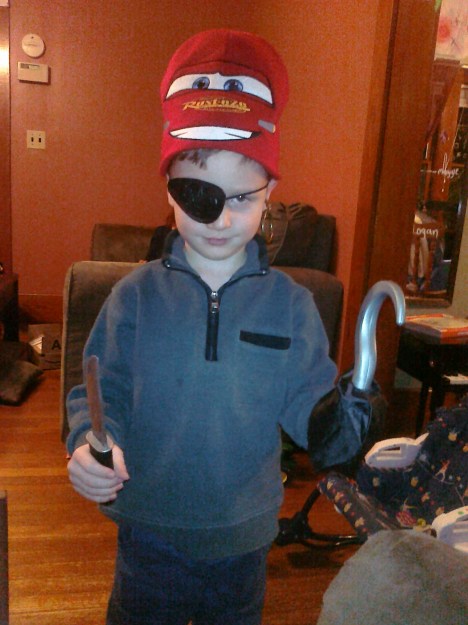 (Yes, those are inflatable pirate hat, shield, and sword – 2 sets! And an inflatable treasure chest as well. Oh and the cannons shoot water if you attach the hose. LOL!)