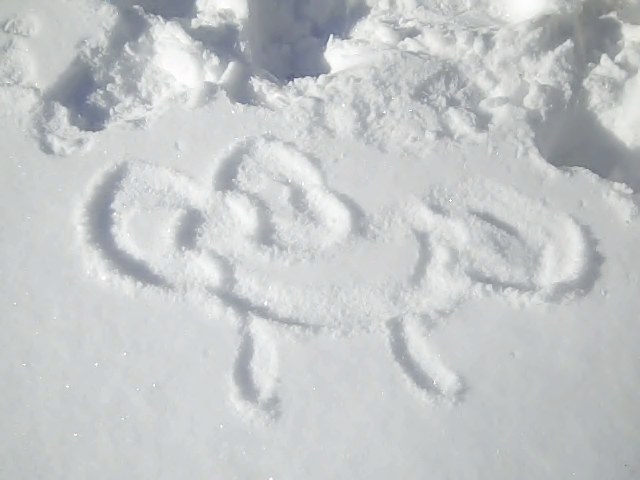 We have two snow angels, one who likes to swing no matter what the weather is, and some snow art. 🙂