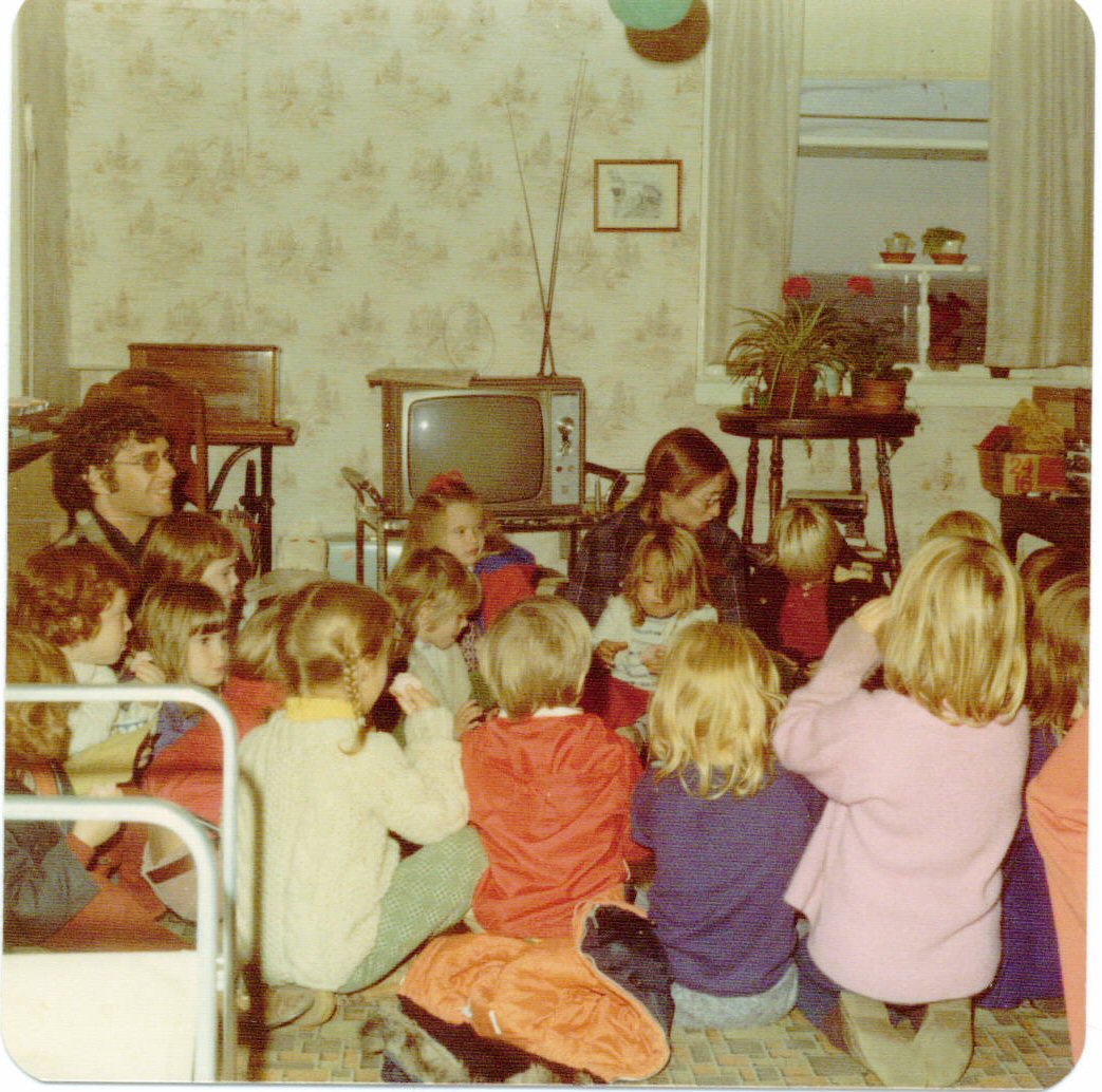 Since my big sister (pretty sure she’s the one in pigtails ) and my big brother (pretty sure he’s the one in the red jacket) are both in this…it’s probably before I was a student at the school. Plus, based on the wallpaper and the lovely linoleum floor…this was pretty early on. So…maybe 1977? 1978?