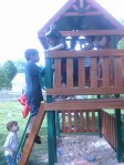 The kids had a blast playing in the kiddie pool (that I broke and partially patched right before everyone got here!), running through the sprinkler, splashing in the water table, swinging, playing in the sandbox, and climbing on the playhouse. In general, being kids π