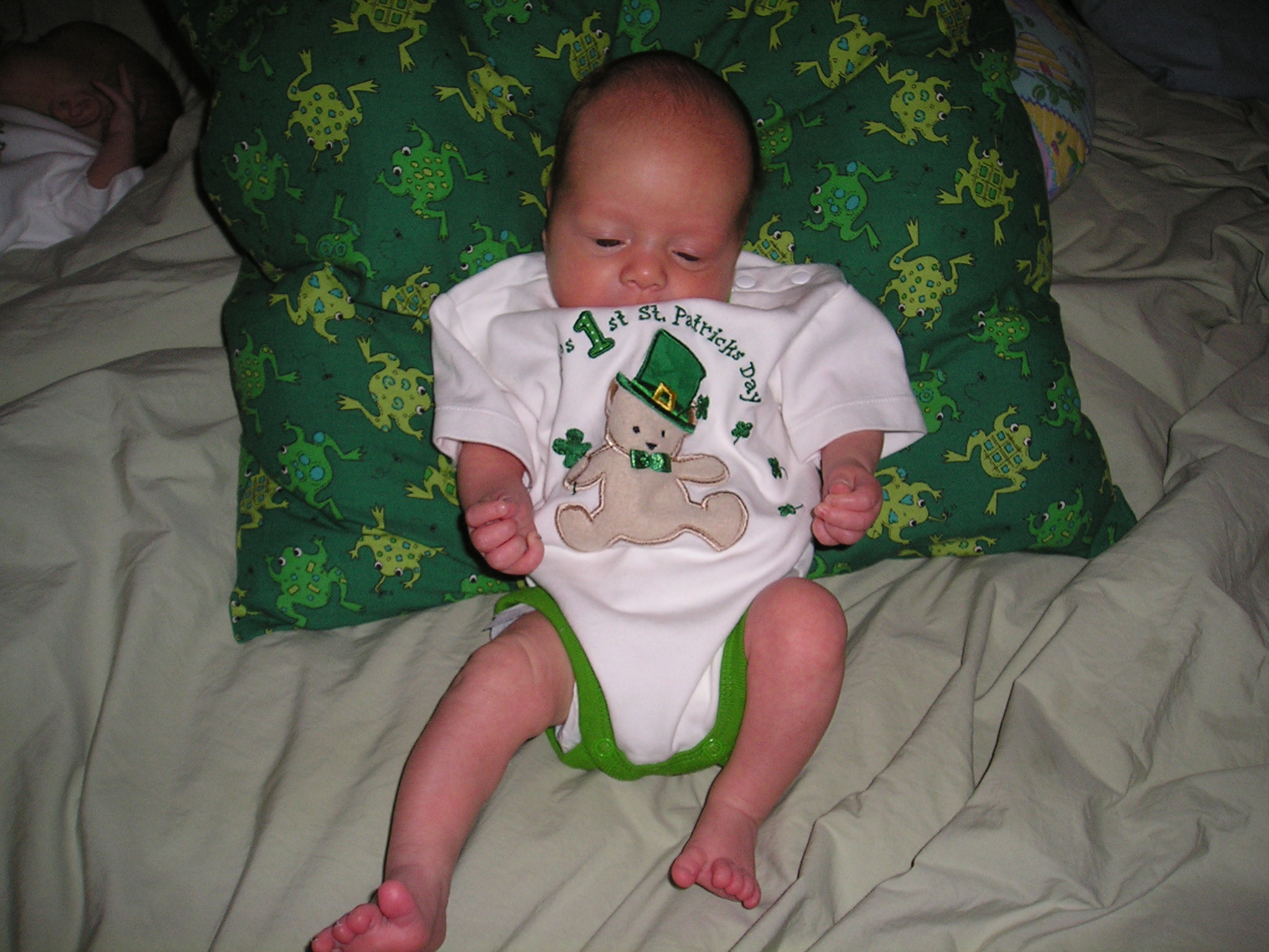 The following pictures were taken on St. Patrick’s Day of 2005 – the kids were just about 2 and a half months old 🙂