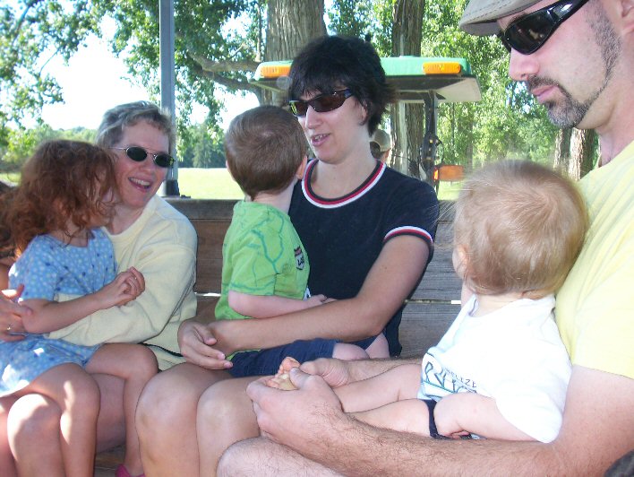 First, you get a hay ride out to the barn (see the AWESOME barn in my last post). Notice how none of my kids are sitting in my lap! (or Mike’s either.)